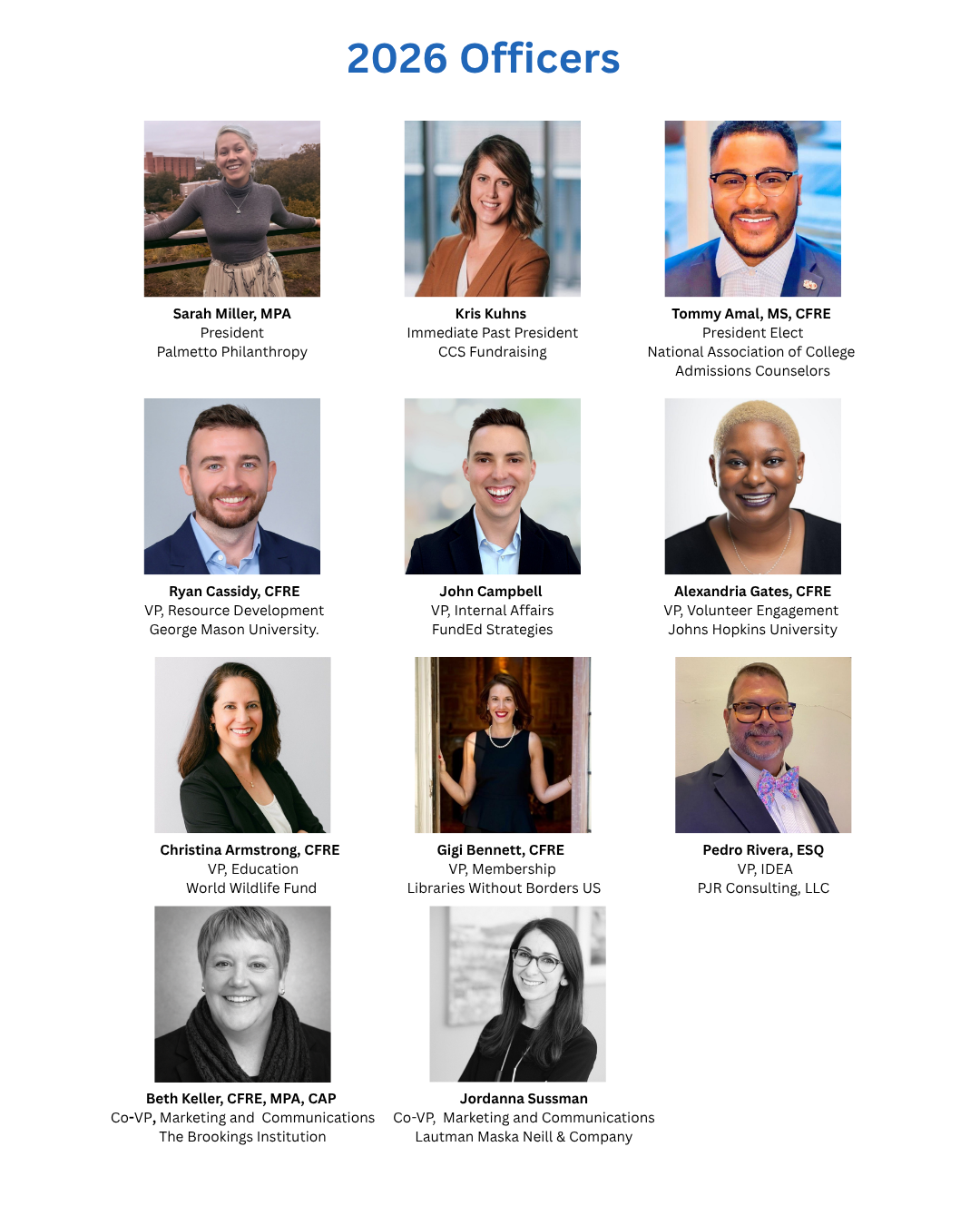 Board of DirectorsThe AFP DC Chapter is led by these volunteer board members. One of the best ways to build relationships is to volunteer alongside your colleagues in the spirit of fellowship and fun. The board is assisted by many volunteers who serve on committees. If you are interested in serving on a Committee, we'd welcome your involvement! Please contact [email protected] for more information.